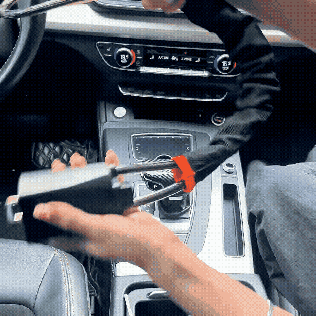 Locks your steering wheel in one click—making thieves choose the next car instead of yours.